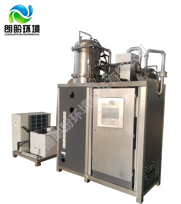 低溫萃取濃縮器的原理是物料的沸點隨著壓強的降低而降低。低溫節能濃縮設備整體保持真空狀態,濃縮室的真空度約為95%~97%,在此壓強下水的沸點為35℃~37℃,系統無需配備進料泵,利用蒸發室的負壓將物料吸進蒸發室,通過強制循環方式將物料循環霧化,傳輸至換熱器上,物料中水分被蒸發,物料連續循環霧化,通過蒸發室液位自動補料,濃度達到要求后作為濃縮液排出設備。濃縮液一般粘度較大,需采用泵抽出。