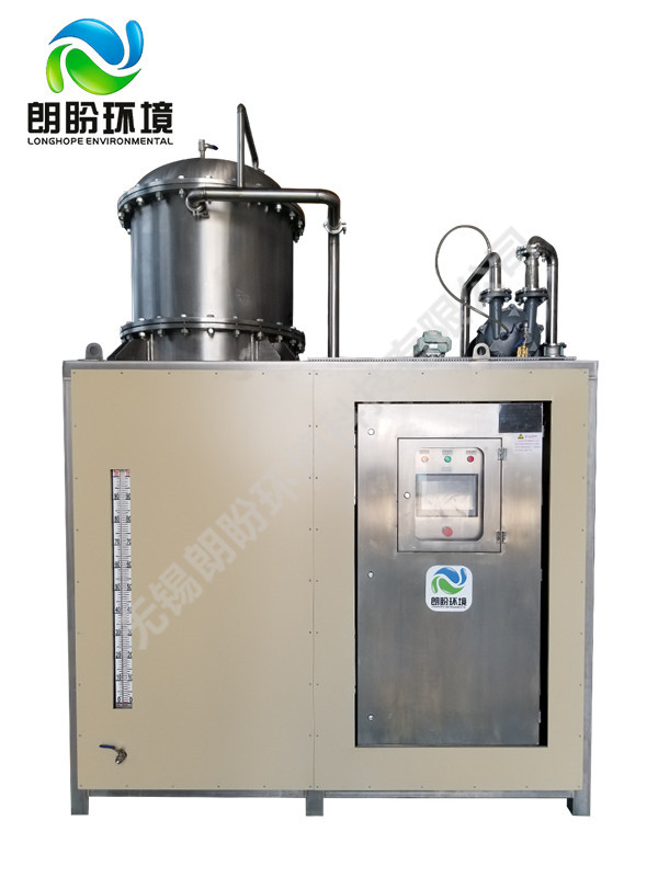 熱泵濃縮蒸發(fā)器的原理是物料的沸點隨著壓強的降低而降低。低溫節(jié)能濃縮設備整體保持真空狀態(tài),濃縮室的真空度約為95%~97%,在此壓強下水的沸點為35℃~37℃,系統(tǒng)無需配備進料泵,利用蒸發(fā)室的負壓將物料吸進蒸發(fā)室,通過強制循環(huán)方式將物料循環(huán)霧化,傳輸至換熱器上,物料中水分被蒸發(fā),物料連續(xù)循環(huán)霧化,通過蒸發(fā)室液位自動補料,濃度達到要求后作為濃縮液排出設備。濃縮液一般粘度較大,需采用泵抽出。