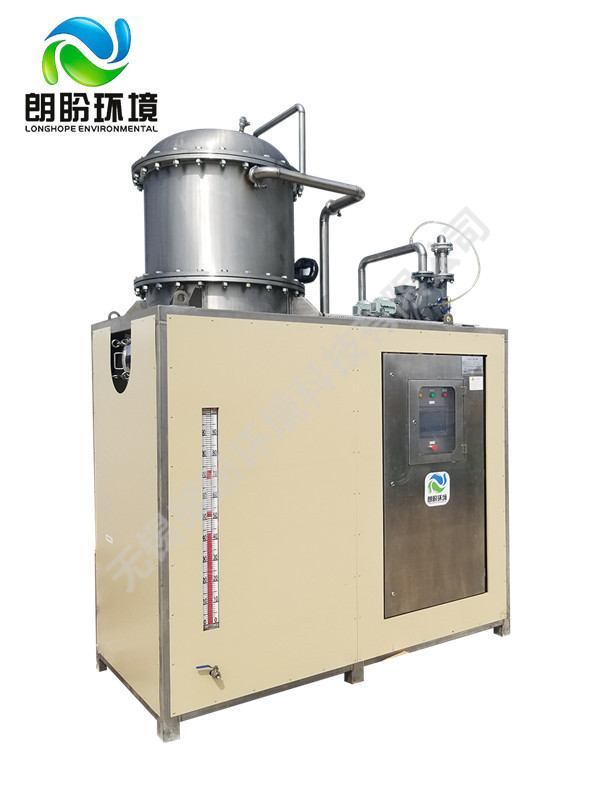 負壓濃縮蒸發器的原理是物料的沸點隨著壓強的降低而降低。低溫節能濃縮設備整體保持真空狀態,濃縮室的真空度約為95%~97%,在此壓強下水的沸點為35℃~37℃,系統無需配備進料泵,利用蒸發室的負壓將物料吸進蒸發室,通過強制循環方式將物料循環霧化,傳輸至換熱器上,物料中水分被蒸發,物料連續循環霧化,通過蒸發室液位自動補料,濃度達到要求后作為濃縮液排出設備。濃縮液一般粘度較大,需采用泵抽出。
